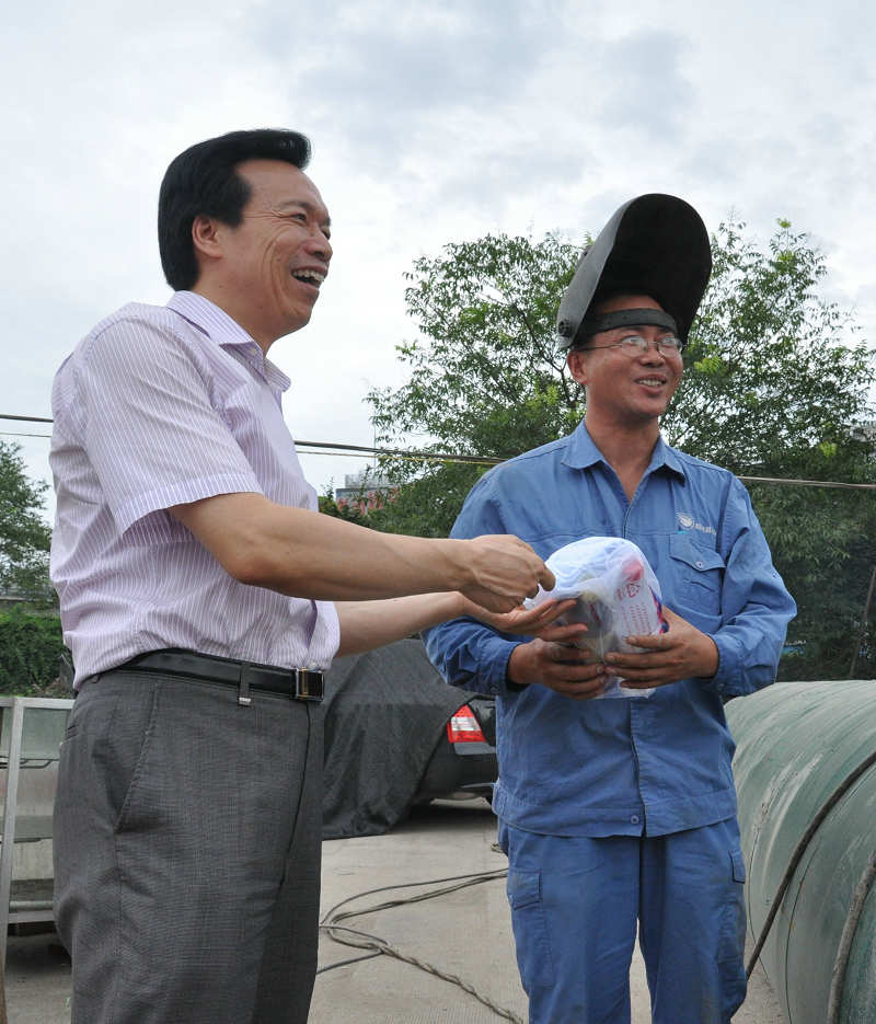 7月12日上午,縣委副書記、縣長孫云耀,縣委副書記孟柏干等縣領(lǐng)導(dǎo)冒著高溫到獨山DN1000自應(yīng)力管改造現(xiàn)場慰問供水公司一線職工,向供水管道安裝人員表示慰問,并送上防暑慰問品,叮囑大家繼續(xù)堅守崗位,科學(xué)安排工作,合理調(diào)整作業(yè)時間,切實做好防暑降溫工作。集團(tuán)公司董事長倪阿泉等有關(guān)領(lǐng)導(dǎo)陪同慰問。