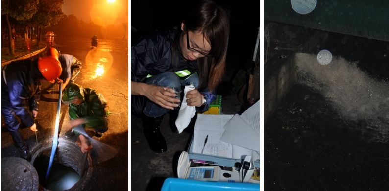 (圖為工作人員進(jìn)行沖洗排放前的關(guān)閥門操作及對(duì)排放口水質(zhì)化驗(yàn)工作)