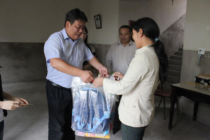 圖為濱海供水公司代表為馬鞍鎮(zhèn)結對貧困兒童送去書包的慰問品及慰問金