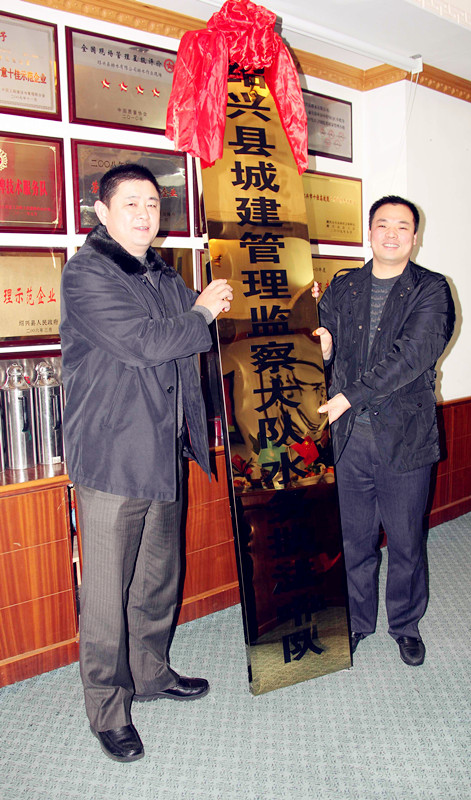 ,紹興縣城建管理監(jiān)察大隊(duì)水務(wù)執(zhí)法中隊(duì)成立授牌儀式在排水公司舉行??h城管辦副主任許立人、集團(tuán)公司副總經(jīng)理馮梁峰等領(lǐng)導(dǎo)參加儀式。