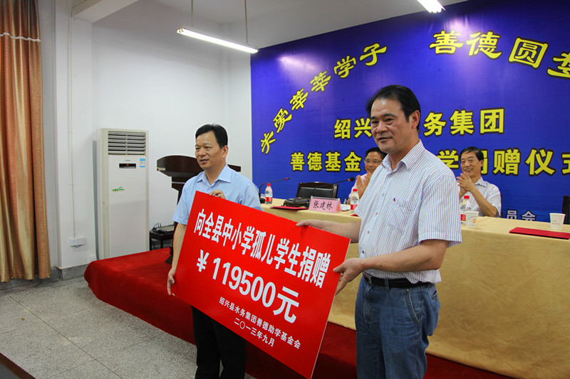 儀式上,集團(tuán)倪董事長介紹了“善德基金”基本情況,并現(xiàn)場向今年受助的全縣81名中小學(xué)孤兒學(xué)生捐贈(zèng)了“善德基金”助學(xué)款119500元,資助標(biāo)準(zhǔn)為小學(xué)生每人每學(xué)年1000元,初中生每人每學(xué)年1500元,高中生每人每學(xué)年2000元,并從今年開始對全縣孤兒從小學(xué)到高中讀書期間每年給予捐助。縣教體局局長蔣國洪以及縣老領(lǐng)導(dǎo)、縣關(guān)工委主任李會(huì)鵬分別作了講話,他們對集團(tuán)強(qiáng)烈的社會(huì)責(zé)任感以及情系困難學(xué)生的善心義舉給予了高度的肯定和贊揚(yáng),希望受助學(xué)生學(xué)會(huì)堅(jiān)守,學(xué)會(huì)感恩,學(xué)會(huì)奉獻(xiàn),并呼吁社會(huì)各界為孩子們快樂成長、展翅高飛而共同努力。