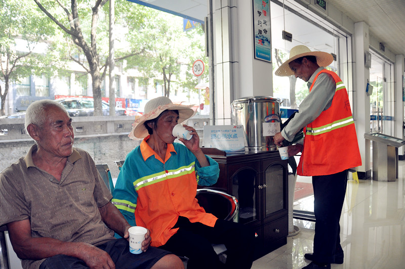 今年6月以來(lái),供水公司積極響應(yīng)浙江之聲廣播電臺(tái)發(fā)起的“一杯水”大型公益活動(dòng),在全區(qū)13個(gè)供水營(yíng)業(yè)大廳設(shè)置了免費(fèi)供水點(diǎn),并配備了醫(yī)藥箱,為高溫下的環(huán)衛(wèi)工人、交警、路政、快遞員等一線勞動(dòng)者提供一處納涼地。公司已連續(xù)三年開(kāi)展該活動(dòng),目前已累計(jì)提供9000多次服務(wù)。圖為三位老人正在城區(qū)供水營(yíng)業(yè)廳飲用茶水。
