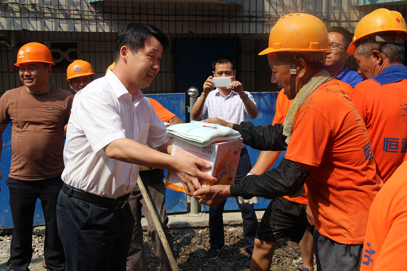 在工程現(xiàn)場,馬焉軍向施工人員送上了飲料、毛巾等防暑降溫物品,詳細(xì)了解了工程進(jìn)展和高溫防護(hù)措施,詢問了施工人員的作息時(shí)間,對大家高溫天氣堅(jiān)守崗位、辛苦勞動的精神表示高度贊揚(yáng),并反復(fù)叮囑現(xiàn)場人員注意身體、勞逸結(jié)合、防暑降溫。這次慰問活動讓工程一線的作業(yè)人員實(shí)實(shí)在在地感受到了上級領(lǐng)導(dǎo)的關(guān)愛之情。