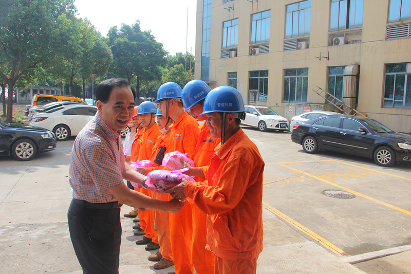 圖為集團黨委副書記、總經(jīng)理單寶子慰問排水公司養(yǎng)護班組工作人員