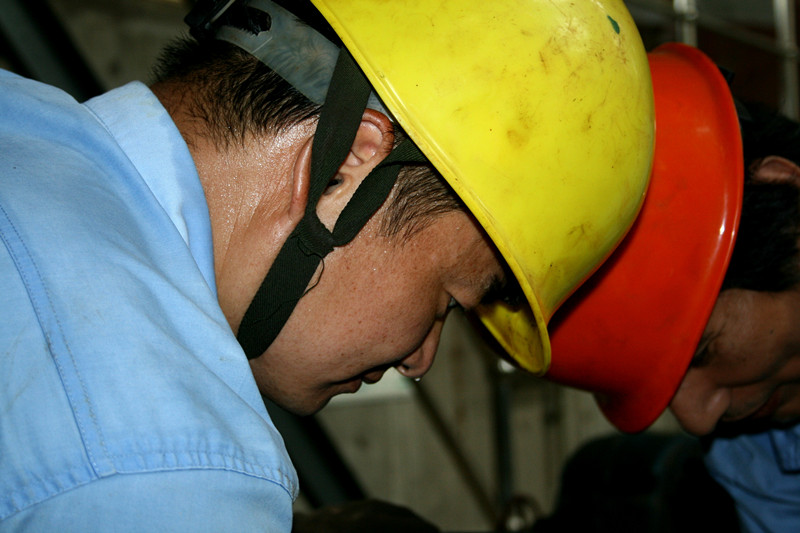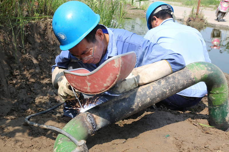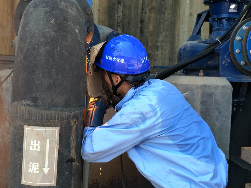 江濱水處理公司設(shè)備部作業(yè)人員正對排泥管道進行搶修焊接作業(yè),焊接時火花四濺,溫度可以達到140℃左右。