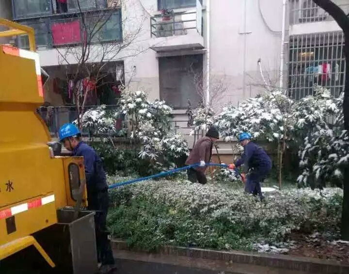 圖為管網(wǎng)養(yǎng)護(hù)員冒雪在柯橋街道紅升景園疏通生活污水管道