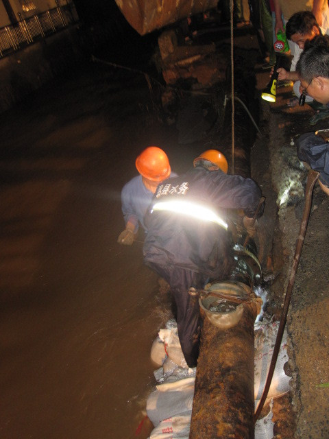 21點(diǎn)10分,搶險(xiǎn)準(zhǔn)備工作全部完畢,供水管道搶修工作正式開始。搶險(xiǎn)隊(duì)員分成兩隊(duì)實(shí)施搶修,在不到6米寬的狹長道路上,搶險(xiǎn)隊(duì)員在被湍急洪水沖刷掏空的路基上,冒著隨時(shí)坍塌的危險(xiǎn),全然不顧個(gè)人安危沖鋒在前,狂風(fēng)大雨下,突擊隊(duì)只有一個(gè)信念:就是要搶時(shí)間,趕進(jìn)度,盡快讓全鎮(zhèn)百姓第二天能正常用水!