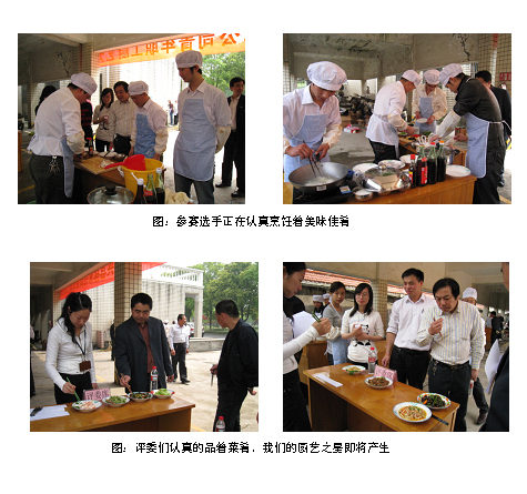 廚藝比賽按部門分為8個小組,每組由4人組成,而參賽都是35周歲以下青年員工。按規(guī)則各組選手均要在規(guī)定的時間內(nèi)完成了比賽所定的一冷菜、二小炒、一煲湯四樣菜式。較往屆此次比賽多了一項規(guī)定金額自選購菜,使參賽小組烹飪的菜肴更具選擇性與特色化。