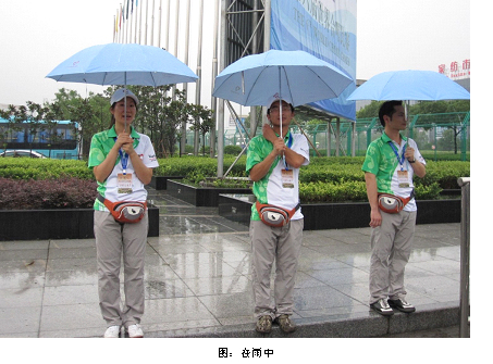 “傘,很多觀眾都沒帶,外面雨好大呀!”林隊長焦急地喊道:“同志們,考驗我們的時刻到了!”這時隊員們二話沒說,很快統(tǒng)一著雨披,手拿著傘,奔向雨中,給如常的觀眾撐傘。隊員們不厭其煩的在大雨中往返于檢票大門和場館安檢口之間,不知跑了多少個來回,直到把一個個觀眾安全地送進場館……我們痛并快樂著!
