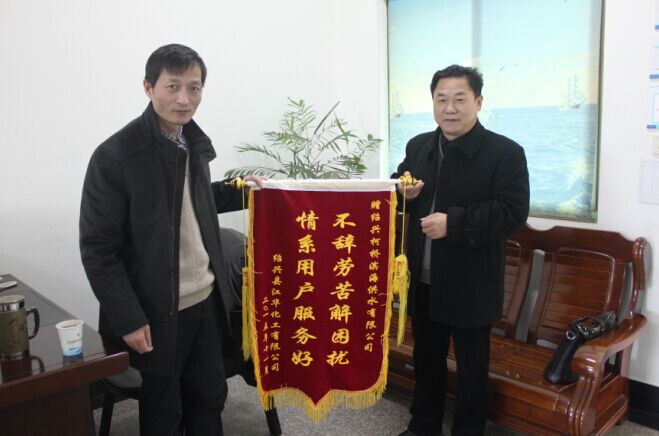 11月30日,紹興江華化工有限公司負責人來到公司,送來 “不辭辛勞解困擾,情系用戶服務(wù)好”的錦旗,對濱海供水公司長期以來為企業(yè)解決難題,營造良好的供水環(huán)境,提供高效的服務(wù)支持過程中表現(xiàn)出來的管理高水平、人員高素質(zhì)、工作高效率表示深深感謝。
