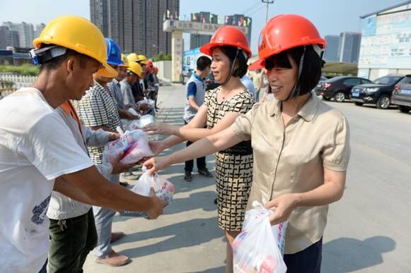 慰問現(xiàn)場,成水鳳一行向奮戰(zhàn)在一線的施工人員送上防暑用品,與工人們握手,詢問工人工作情況和工地的防暑降溫工作,對工人們的辛苦奉獻(xiàn)表示感謝,還特別叮囑工人一定要注意防暑降溫,合理安排施工時(shí)間,在安全的前提下保質(zhì)保量地完成施工任務(wù)。